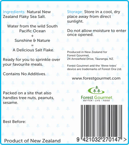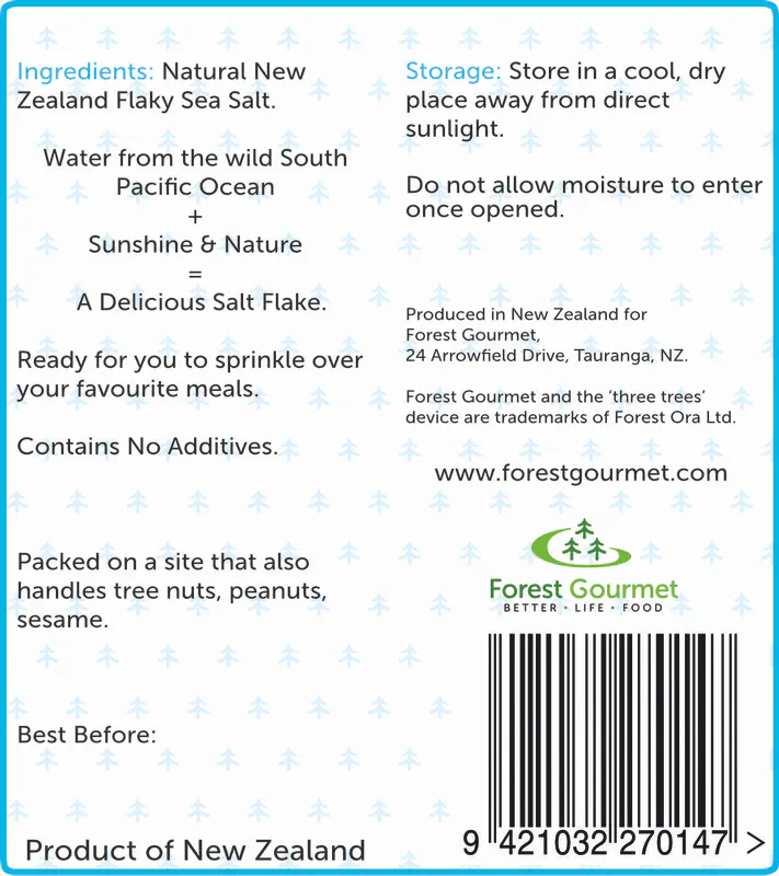 Finest Flaky Sea Salt - sourced from Marlborough New Zealand. Packed in a resealable, compostable, 125g pouch.