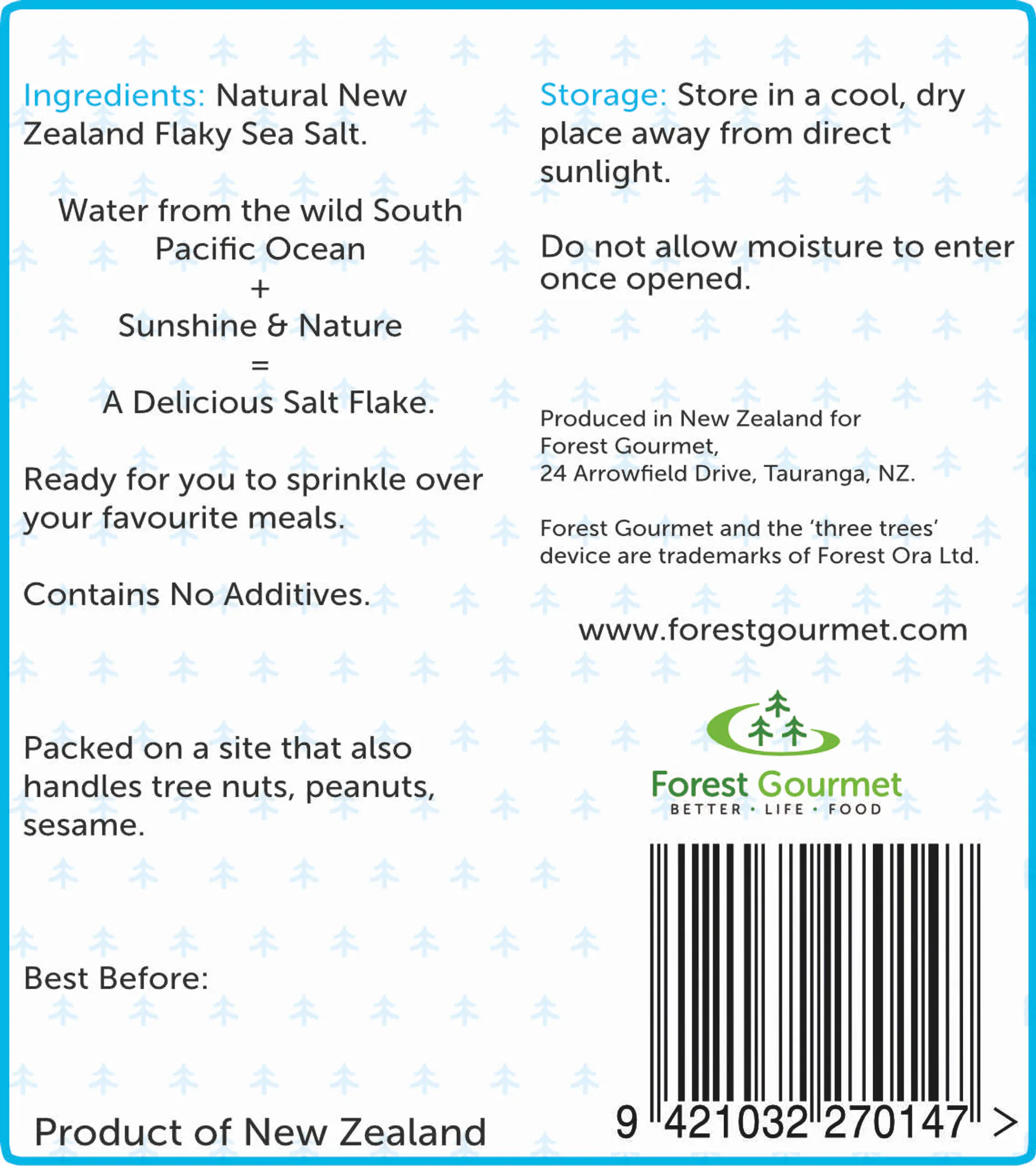 Finest Flaky Sea Salt - sourced from Marlborough New Zealand. Packed in a resealable, compostable, 125g pouch.